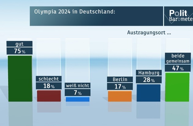 Bisher gibt es in Berlin und Hamburg Bestrebungen, sich für die Olympischen Spiele zu bewerben. Die meisten Deutschen (47 Prozent) sind allerdings der Meinung, dass sich Berlin und Hamburg gemeinsam um die Spiele bewerben sollten. Für Hamburg alleine sprechen sich 28 Prozent aus und für Berlin 17 Prozent.