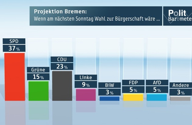 Wenn schon am nächsten Sonntag gewählt würde, dann ergäben sich die folgenden Projektionswerte für die Parteien: Die SPD käme zurzeit auf 37 Prozent, die Grünen auf 15 Prozent, die CDU auf 23 Prozent, die Linke auf 9 Prozent, die BiW ("Bürger in Wut") auf 3 Prozent, die FDP und die AfD auf jeweils 5 Prozent. Die anderen Parteien lägen zusammen bei 3 Prozent.