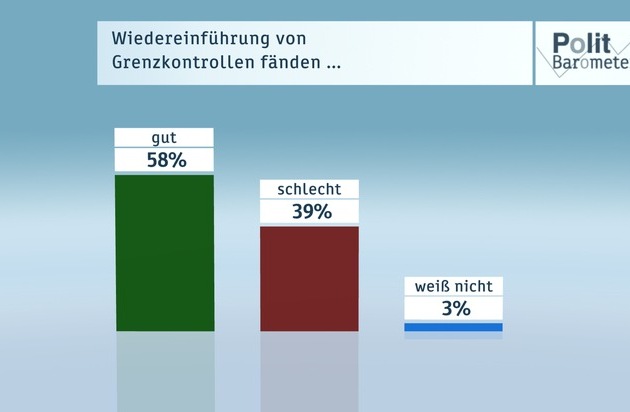 Eine Mehrheit von 58 Prozent fände es gut, wenn es wegen der Flüchtlingskrise wieder Grenzkontrollen gäbe, auch wenn dadurch das Reisen und der Güterverkehr in Europa erschwert werden. 39 Prozent sprechen sich gegen eine Wiedereinführung von Grenzkontrollen aus, die im Rahmen des Schengen-Abkommens zwischen den meisten europäischen Ländern abgeschafft wurden (Rest zu 100 Prozent hier und im Folgenden "weiß nicht"). Im Detail befürworten 51 Prozent der CDU/CSU-Anhänger, 49 Prozent der SPD- und 45 Prozent der Linke-Anhänger Grenzkontrollen. Von den Anhängern der Grünen unterstützen dies nur 26 Prozent, während in der Anhängerschaft der FDP (61 Prozent) und vor allem der AfD (90 Prozent) klare Mehrheiten dafür sind.