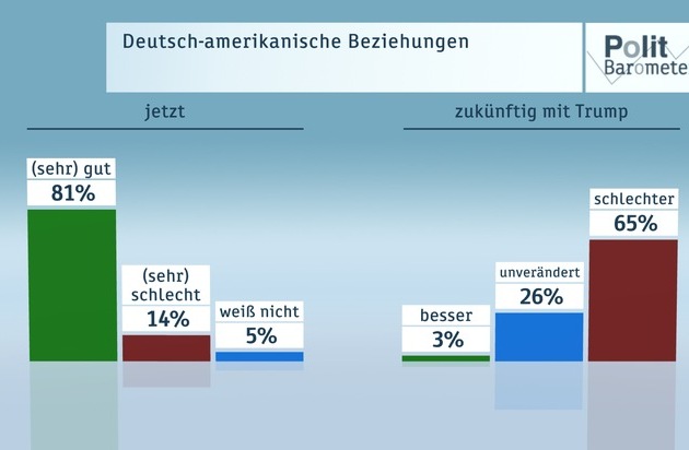 Die aktuellen Beziehungen zwischen Deutschland und den USA bewerten 81 Prozent als sehr gut oder gut, lediglich 14 Prozent bezeichnen sie als schlecht oder sehr schlecht. Allerdings erwarten 65 Prozent, dass sich diese Beziehungen unter einem Präsidenten Trump verschlechtern werden, 26 Prozent gehen davon aus, dass sich daran nichts ändern wird, und 3 Prozent glauben an eine Verbesserung.