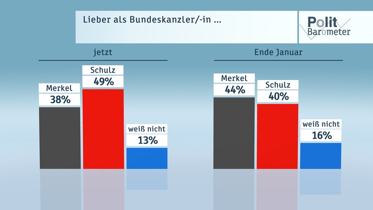 Inzwischen wollen nur noch 38 Prozent Angela Merkel lieber als Kanzlerin, während jetzt 49 Prozent Martin Schulz bevorzugen. Ende Januar hatte Merkel noch mit 44 Prozent knapp vor Schulz mit 40 Prozent gelegen. Bei einem direkten Vergleich halten 23 Prozent Merkel für glaubwürdiger und 20 Prozent Schulz, während die meisten (46 Prozent) da keinen großen Unterschied sehen. In Sachen "Sympathie" führt Schulz mit 36 Prozent der Nennungen klar vor Merkel mit 22 Prozent (kein Unterschied: 33 Prozent). Den größeren Sachverstand sehen hingegen 34 Prozent bei Merkel und nur 10 Prozent bei Schulz (kein Unterschied: 38 Prozent).