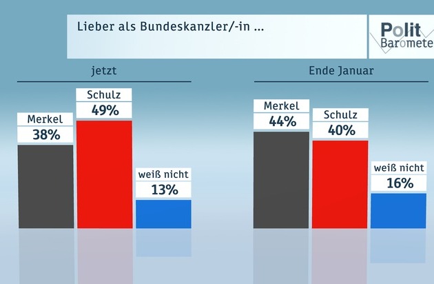 Die Umfrage zum Politbarometer wurde wie immer von der Mannheimer Forschungsgruppe Wahlen durchgeführt. Die Interviews wurden in der Zeit vom 14. bis 16. Februar 2017 bei 1.231 zufällig ausgewählten Wahlberechtigten telefonisch erhoben. Die Befragung ist repräsentativ für die wahlberechtigte Bevölkerung in Deutschland. Der Fehlerbereich beträgt bei einem Anteilswert von 40 Prozent rund +/- drei Prozentpunkte und bei einem Anteilswert von 10 Prozent rund +/- zwei Prozentpunkte. Daten zur politischen Stimmung: CDU/CSU: 32 Prozent, SPD: 42 Prozent, Linke: 5 Prozent, Grüne: 9 Prozent, FDP: 6 Prozent, AfD: 6 Prozent. Das nächste Politbarometer sendet das ZDF am Freitag, 10. März 2017.