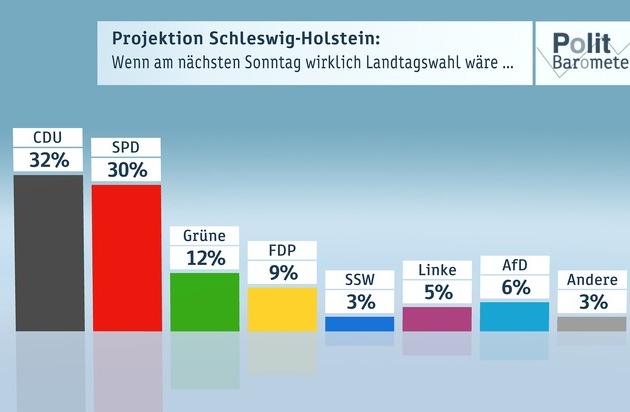 Wenn schon am nächsten Sonntag gewählt würde, dann ergäben sich folgende Projektionswerte für die Parteien: Die CDU käme zurzeit auf 32 Prozent, die SPD auf 30 Prozent, die Grünen auf 12 Prozent, die FDP auf 9 Prozent, der SSW auf 3 Prozent, die Linke auf 5 Prozent und die AfD auf 6 Prozent. Die anderen Parteien, darunter auch die Piraten, kämen zusammen auf 3 Prozent.