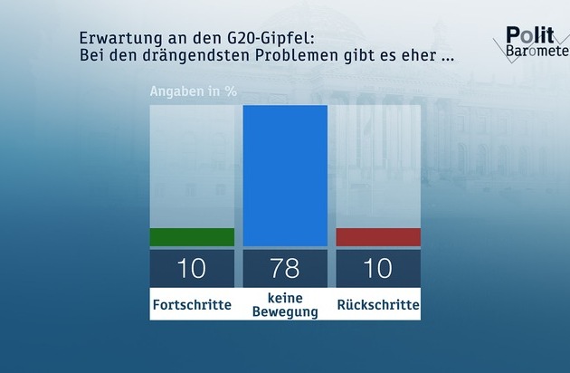 Eine große Mehrheit der Befragten (78 Prozent) erwartet, dass sich mit Blick auf die weltweit drängendsten Probleme auf dem G20-Gipfel in Hamburg nicht viel bewegen wird. Nur 10 Prozent rechnen insgesamt eher mit Fortschritten bei der Lösung der anstehenden Gipfel-Themen und ebenfalls 10 Prozent glauben, dass es eher Rückschritte geben wird (Rest zu 100 Prozent hier und im Folgenden jeweils "weiß nicht"). Dabei ist für 33 Prozent der Klimawandel das wichtigste globale Problem, für 29 Prozent steht das Thema Flüchtlinge und Fluchtursachen ganz oben, für 27 Prozent hat die Bekämpfung des Terrorismus größte Priorität, und nur für 7 Prozent sind die Probleme im Bereich Weltwirtschaft und freier Handel am vordringlichsten. Das alles vor dem Hintergrund, dass 66 Prozent die wirtschaftliche und politische Lage in der Welt derzeit als besonders unsicher bezeichnen. 33 Prozent glauben nicht, dass wir in besonders unsicheren Zeiten leben.