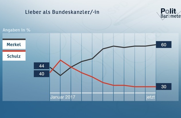 Ähnlich wie seit Mitte Mai wünschen sich jetzt 60 Prozent (plus 1) Angela Merkel im Amt und nur 30 Prozent (unverändert) sprechen sich für Martin Schulz als künftigen Kanzler aus. Während die CDU/CSU-Anhänger praktisch geschlossen (97 Prozent) hinter Merkel stehen, sind bei den SPD-Anhängern nur 66 Prozent (minus 4) für Martin Schulz, aber gut jeder Vierte (29 Prozent; plus 4) will lieber Merkel als Kanzlerin. Mehrheitliche Zustimmung findet Merkel bei den Anhängern der FDP (76 Prozent), die Anhänger der Grünen sind eher geteilter Meinung (47 Prozent Merkel, 42 Prozent Schulz). Bei den Linken sind 56 Prozent für Schulz und 31 Prozent für Merkel und bei den Anhängern der AfD geben 49 Prozent Schulz den Vorzug und 31 Prozent Merkel (der Rest zu 100 Prozent entweder "keinen von beiden" oder "weiß nicht").