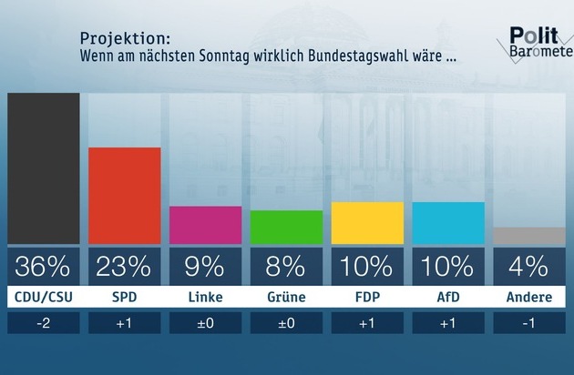 In der Politbarometer-Projektion verliert die Union weitere zwei Prozentpunkte. Wenn schon am nächsten Sonntag Bundestagswahl wäre, käme die CDU/CSU jetzt auf 36 Prozent (minus 2), die SPD auf 23 Prozent (plus 1), die Linke erreichte unverändert 9 Prozent und die Grünen unverändert 8 Prozent. Die FDP käme auf 10 Prozent (plus 1) und auch die AfD könnte auf 10 Prozent (plus 1) zulegen. Die anderen Parteien zusammen erhielten 4 Prozent (minus 1). Damit gäbe es neben einer großen Koalition weiterhin nur eine Mehrheit für eine Regierung aus CDU/CSU, Grüne und FDP. Für alle anderen politisch realistischen Koalitionen würde es nicht reichen.