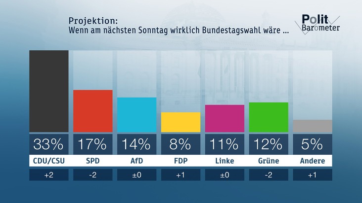 Wenn am nächsten Sonntag wirklich gewählt würde, dann käme die CDU/CSU jetzt auf 33 Prozent (plus 2), die SPD nur noch auf 17 Prozent (minus 2). Die AfD erreichte 14 Prozent (unverändert), die FDP 8 Prozent (plus 1), die Linke 11 Prozent (unverändert) und die Grünen erhielten 12 Prozent (minus 2). Die anderen Parteien lägen zusammen bei 5 Prozent (plus 1).