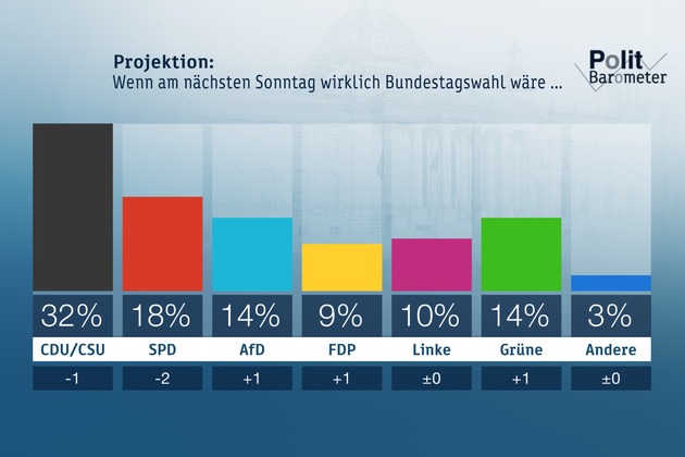 Nach dem Asylstreit haben alle Regierungsparteien Einbußen zu verzeichnen. Wenn am nächsten Sonntag wirklich Bundestagswahl wäre, käme die Union auf 32 Prozent (minus 1). Die SPD erreichte nur noch 18 Prozent (minus 2). Zugewinne hätten dagegen die AfD mit 14 Prozent (plus 1), die FDP mit 9 Prozent (plus 1) und die Grünen mit 14 Prozent (plus 1). Die Linke bliebe unverändert bei 10 Prozent und die anderen Parteien erreichten zusammen erneut 3 Prozent. Neben einer großen Koalition hätte damit von den derzeit politisch denkbaren Bündnissen nur eine Jamaika-Koalition aus CDU/CSU, FDP und Grünen eine parlamentarische Mehrheit.