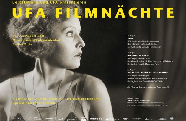 Welturaufführung mit eigens zusammengestelltem UFA-FilmorchesterBertelsmann und die UFA laden zum fünften Mal zu den UFA Filmnächten auf die Berliner Museumsinsel. Vom 20. bis zum 22. August präsentieren das internationale Medien-, Dienstleistungs- und Bildungsunternehmen sowie die führende deutsche Filmproduktionsgesellschaft gemeinsam bekannte Filme der Kinogeschichte mit musikalischer Live-Begleitung in spektakulärer historischer Kulisse. Die UFA Filmnächte bleiben damit auch im fünften Jahr des Bestehens ihrer Linie treu, Filmgeschichte in architektonisch-historischer Einbettung zu zeigen. 2011 noch vor der Orangerie im Schlosspark Sanssouci, 2012 und 2013 auf dem Schinkelplatz in Mitte, zogen die UFA Filmnächte 2014 auf die Museumsinsel vor die Alte Nationalgalerie.
