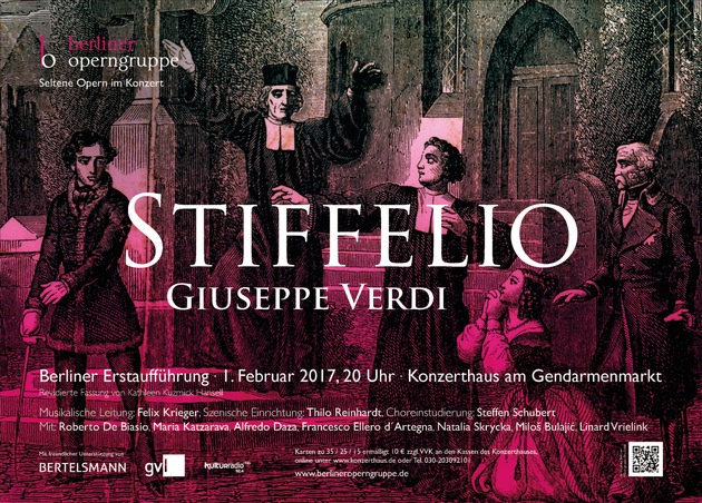 Dem Berliner Publikum wird das musikalische Highlight von der auf seltene Opern spezialisierten "Berliner Operngruppe" um Dirigent Felix Krieger präsentiert. Das junge Ensemble führt den Stiffelio mit Unterstützung von Bertelsmann im Konzerthaus am Gendarmenmarkt semiszenisch auf. Zu den Solisten zählen auch zwei Talente aus dem von Liz Mohn geförderten Opernstudio der Staatsoper Berlin.