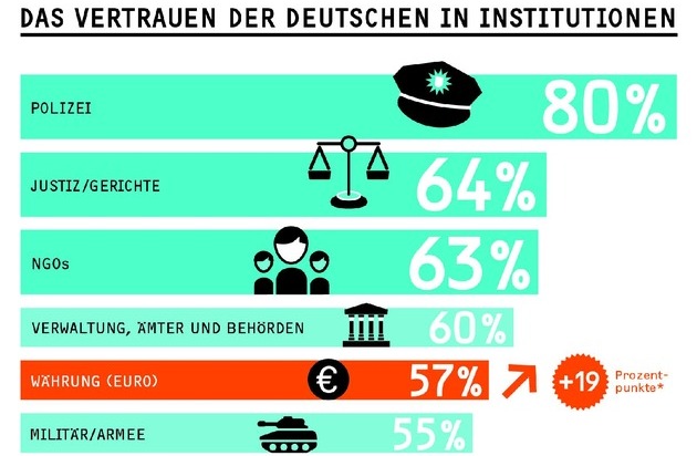 57 Prozent der Deutschen schenken dem Euro ihr Vertrauen. Das sind 19 Prozentpunkte mehr als in der Befragung des Jahres 2013. Damit nimmt der Euro im Ranking der vertrauenswürdigsten Institutionen den fünften Platz ein. "Ein Grund für diese Steigerung dürfte die moderate Teuerungsrate sein, vor allem die momentan vergleichsweise stabilen Energiekosten", sagt Professor Dr. Raimund Wildner, Geschäftsführer des GfK Vereins. Die meisten anderen Institutionen, nach denen der GfK Verein jährlich fragt, behaupten ihren Platz im Ranking. Die Polizei führt weiterhin mit 80 Prozent, gefolgt von den Gerichten mit 64 Prozent. Im internationalen Vergleich erreicht die deutsche Polizei damit einen glänzenden Wert. Besonders misstrauisch reagieren dagegen die Nigerianer und Argentinier: Nur 13 Prozent bzw. 21 Prozent sprechen der Polizei ihr Vertrauen aus.