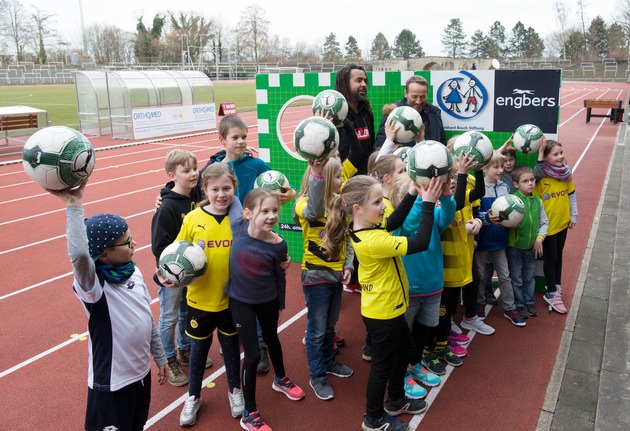 engbers: Wotan Wilke Möhring und Patrick Owomoyela kicken mit Zweitklässlern für den guten Zweck
