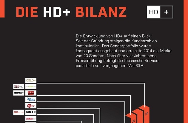 Das Geschäftsjahr 2014 stand ganz im Zeichen der Weiterentwicklung. Mit dem Disney Channel HD, RTL NITRO HD, n-tv HD, ProSieben MAXX HD und TLC HD sind 2014 fünf neue Sender auf die HD+ Plattform aufgeschaltet worden. Am 1. Januar 2015 ist SAT.1 Gold HD dazugekommen. Neben 20 der größten Privatsender können HD+ Kunden auch mehr als 30 weitere Sender in bester Bild- und Tonqualität empfangen.