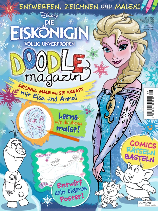 Mit Disney Doodle veröffentlicht Egmont Ehapa am 27.07. ein kreatives Ausmalmagazin für Kinder. Die erste Ausgabe enthält zahlreiche Ausmal-, Mal- und Bastelvorlagen zu "Disney Die Eiskönigin - Völlig unverfroren". Aber auch andere Themenwelten, wie beispielsweise "Disney Cars", sind Hauptthema der kommenden Ausgaben. Gerade für Vorschulkinder bietet das Magazin mit kreativen Bildern, lustigen Ausmalgeschichten und anspruchsvollen Malvorlagen viel Spaß bei geringer Frustrationsrate. Das Magazin fördert die Kreativität und animiert zu Kleinkunstwerken - und mit dem beiliegenden Buntstifte-Set können die Kinder sofort starten!