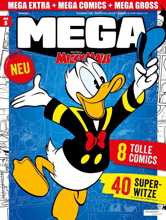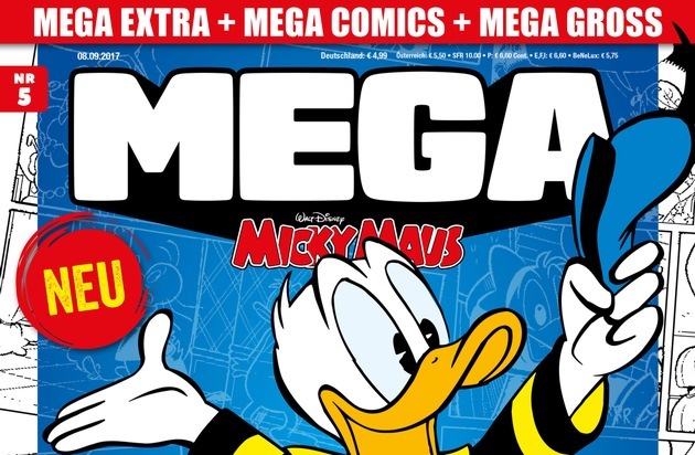 Mit Mega-Format, Mega-Extra, Mega-Comics und Mega-Spaß erscheint ab 8. September zusätzlich zum Micky Maus-Magazin regelmäßig die größte "Maus" aller Zeiten: In der MEGA Micky Maus erwartet die Leserinnen und Leser alle zwei Monate ein neues, vollgepacktes Magazin im XL-Format, mit 60 Seiten der besten Comics aus Entenhausen. Als hochwertiges Mega-Extra liegt der ersten Ausgabe ein aufregendes Spionage-Abhörgerät mit Mikrofon und Kopfhörern bei. Jeder Hobby-Agent ist damit zum Lösen von Kriminalfällen bestens ausgerüstet.