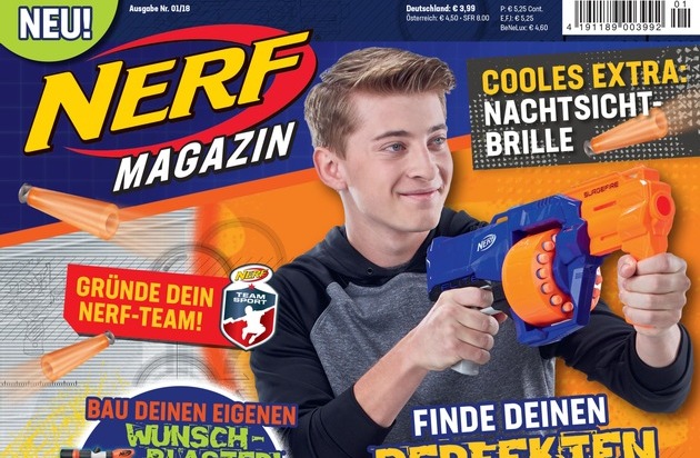 Am 17. April erscheint das erste, offizielle NERF-Magazin, passend zu den erfolgreichen Blastern mit Schaumstoffdarts von Hasbro. Das actiongeladene Heft richtet sich an Jungs zwischen sieben und elf Jahren und erscheint zunächst einmalig. Als Extra erwartet die Leser ein aufregendes Match-Set mit Nachtsichtbrille und zwei Zielen zum Anvisieren - damit ist man für jeden Wettkampf bestens vorbereitet. Mit einem einfachen Schaumstoffball begann vor fast 50 Jahren die Geschichte der Marke in den USA. Seit 2009 gibt es NERF endlich in Deutschland und garantiert seitdem spannende Matches und Wettkämpfe - nicht nur im Kinderzimmer.