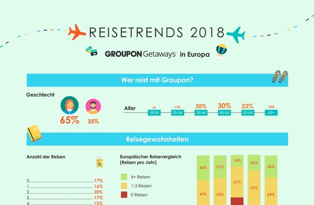 "Wir erwarten auch in 2018 einen noch stärkeren Trend zum Urlaub im eigenen Land", so Natascha Engler, Director Category Management Europa, "Ganze 90% der Befragten haben über Groupon Reisen innerhalb des Heimatlandes gebucht. 4 Prozent davon sogar in der eigenen Stadt. Das zeigt, wie attraktiv Kurztrips für die Verbraucher sind und Wochenendtrips liegen auch 2018 hoch im Trend. Das belegt auch die Anzahl an Reisen, die im vergangenen Jahr getätigt wurden. 29 Prozent der Befragten haben 2017 vier oder mehr Reisen mit Groupon getätigt." Ein Viertel der Befragten haben über Groupon Reisen innerhalb Europas gebucht und nur 3 Prozent sind international verreist. Die Italiener (93 Prozent) bleiben am ehesten in ihrer Heimat, während die Deutschen mit 39 Prozent eher in andere europäische Länder verreisen.