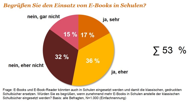 Besonders jüngere Befragte befürworteten die Einführung von E-Books an den Schulen. So lag die Zustimmung unter den 18- bis 29-Jährigen bei 62 Prozent, unter den 30- bis 39-Jährigen sogar bei 65 Prozent. Deutlich skeptischer waren die Älteren. Unter den Über-60-Jährigen zeigten sich nur 42 Prozent aufgeschlossen für das Thema. Als wichtigste Argumente, die für elektronische Schulbücher sprechen, wurden "weniger Gewicht" (60 %) und "geringerer Platzbedarf" (58 %) genannt. Jeder zweite Befragte sieht zudem in der Möglichkeit, den Inhalt ständig zu aktualisieren, einen großen Vorteil. Als mögliche Nachteile wurde gesagt, dass Kinder ohnehin schon "genug vor dem Computer, Fernseher usw. sitzen" (56 Prozent). Fast ebenso viele Befragte (54 %) gaben zu bedenken, mit E-Books hänge der Lernerfolg stark davon ab, dass die Technik auch tatsächliche funktioniere.