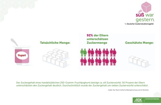92 Prozent der Eltern unterschätzen den Zuckergehalt in einem handelsüblichen 250-Gramm-Fruchtjoghurt. Durchschnittlich gehen sie von nur vier statt der tatsächlichen elf Zuckerwürfel in einem solchen Joghurtbecher aus. Diese Fehleinschätzung macht sich im Gesundheitszustand der Kinder bemerkbar: Je stärker die Eltern den Zuckergehalt unterschätzen, umso höher ist der Body-Maß-Index der Kinder. Zu diesem Ergebnis kommt eine aktuelle wissenschaftliche Untersuchung des Max-Planck-Instituts für Bildungsforschung in Zusammenarbeit mit der Universität Mannheim, die heute auf dem 1. Deutschen Zuckerreduktionsgipfel in Berlin vorgestellt wurde. Dort diskutieren auf Initiative des AOK-Bundesverbandes Vertreter aus Politik, Industrie, Wissenschaft und Gesundheitsbranche über Wege, den Anteil von Zucker, aber auch von Salz und Fett in Lebensmitteln zu verringern.