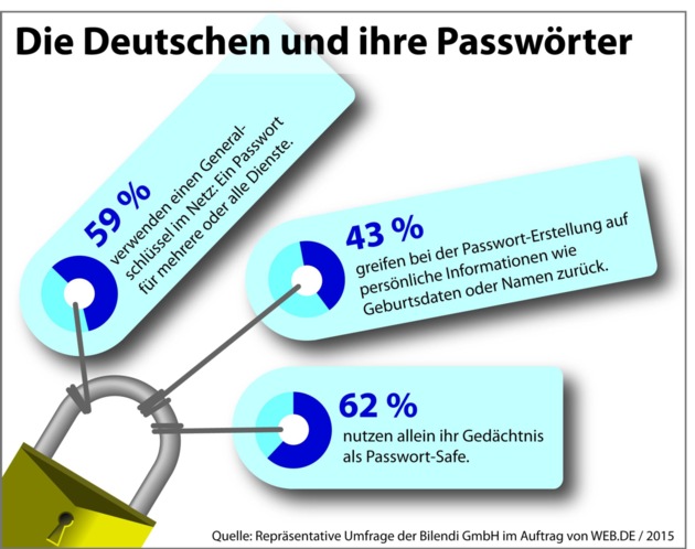 Deutsche Internet-Nutzer lieben Generalschlüssel und Eselsbrücken, wenn es um ihre Passwörter geht. Das geht aus einer repräsentativen Studie hervor, die das Internet-Portal WEB.DE zum heutigen Tag der Passwort-Sicherheit veröffentlicht hat. Diese Vorlieben sind in vielen Fällen gefährlich, in manchen aber äußerst clever.