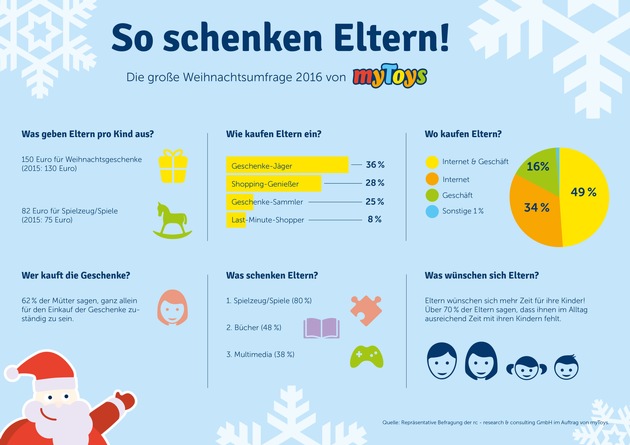 Eltern planen in diesem Jahr im Durchschnitt 150 Euro pro Kind für Weihnachtsgeschenke auszugeben - 20 Euro mehr als im Vorjahr. Davon werden erneut mehr als die Hälfte (82 Euro) in Spielzeug und Spiele investiert. Zum Vergleich: 2015 waren es 75 Euro. Zu den beliebtesten Geschenken von Eltern für Kinder zählen neben Spielzeug und Gesellschaftsspielen (80%) immer noch Bücher (48%). Nur 38% der Eltern planen, Multimedia-Produkte zu verschenken. Das ergab eine repräsentative Umfrage der rc - research & consulting GmbH im Auftrag von myToys, dem Nr. 1 Online-Shop für Spielzeug und Produkte rund ums Kind in Deutschland.